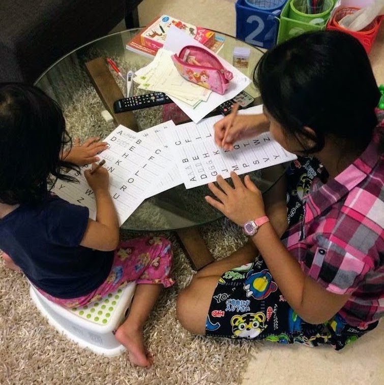 私たちは最近シンガポールでも人気となってきているミャンマー出身の20代前半の女性にメイドとして働いてもらっていますが、ミャンマーの首都ヤンゴンでは平均的な月収は約1万円らしいので、シンガポールでメイドをすればその数倍を若い女性でも稼げることになります。ミャンマー人はフィリピン人と比較して英語が苦手ですが、写真にあるように娘と一緒に基礎から勉強して、うちで働き始めて半年で話すことはもちろん、読み・書きも含めてかなり上達しました。