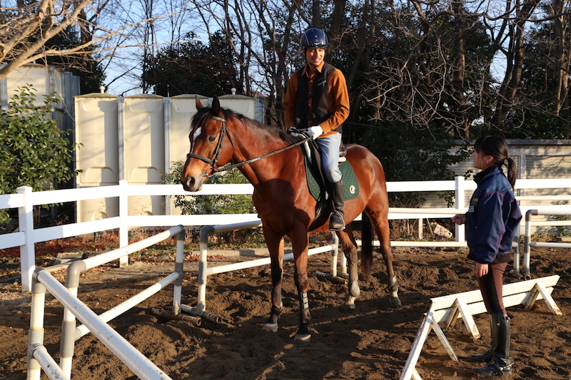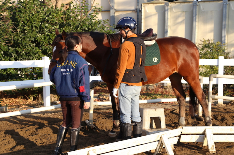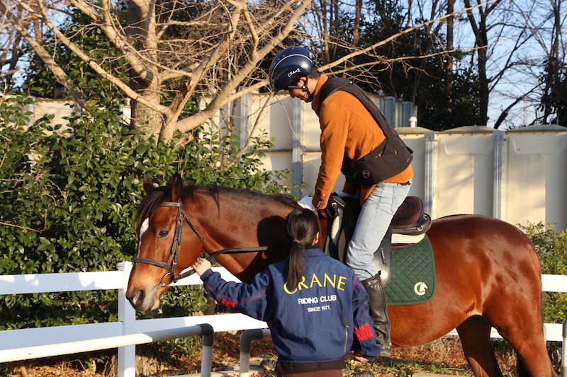 馬場に馬を連れてきたらレッスンのはじまり。まずは「騎乗」を学びます。