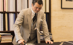 「シルク100%のコ―トはいかがでしょうか? 昨年チェスタータイプで展開し、大ヒットした一着です。とにかく軽い。着てみるとその違いは歴然です。そして保温性も良い。自然光の下で見ると、上品な光沢があるところもいいですね。デザイン的には、今年のコートは、ステンカラーが注目されています。これは前から見るとセットイン、後ろから見るとラグランという作りでして、両者のいいとこ取りをした結果、着心地が非常によくなっています」