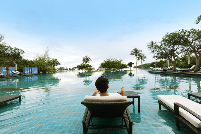 ホテル利用者以外が立ち入らないプライベートビーチで、青い海と白い砂浜を満喫。好きなときに好きなだけ南国の海を感じられる。遠く水平線の向こうに見えるのはタイの大地。