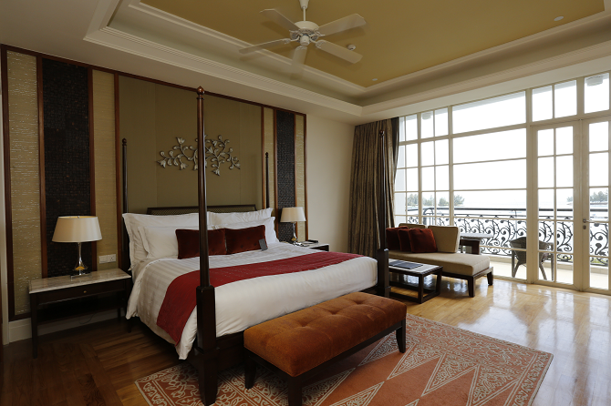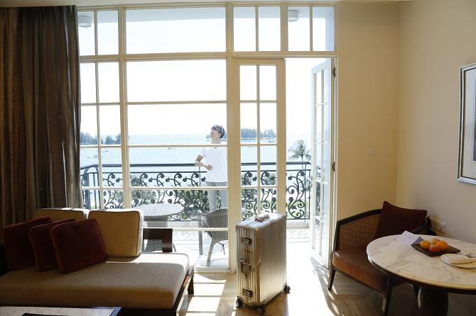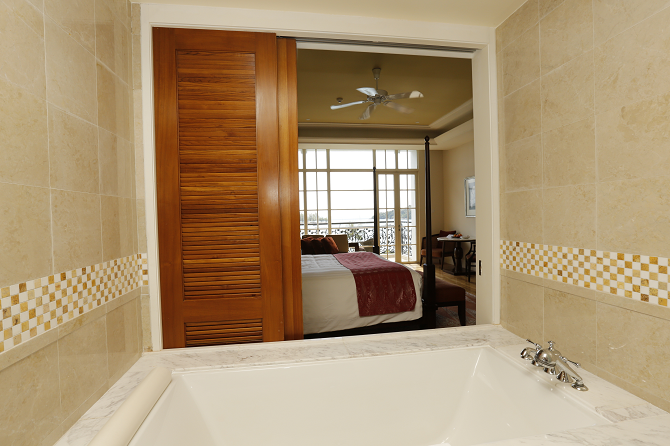 部屋のテラスに立つと目の前には巨大なインフィニティプール、その向こうには海が広がっている。ときたま通り抜ける南国の風が実に心地よい。バスルームからもプールと海を眺められる設計で、どこにいても潮風を感じられるのはさすが。